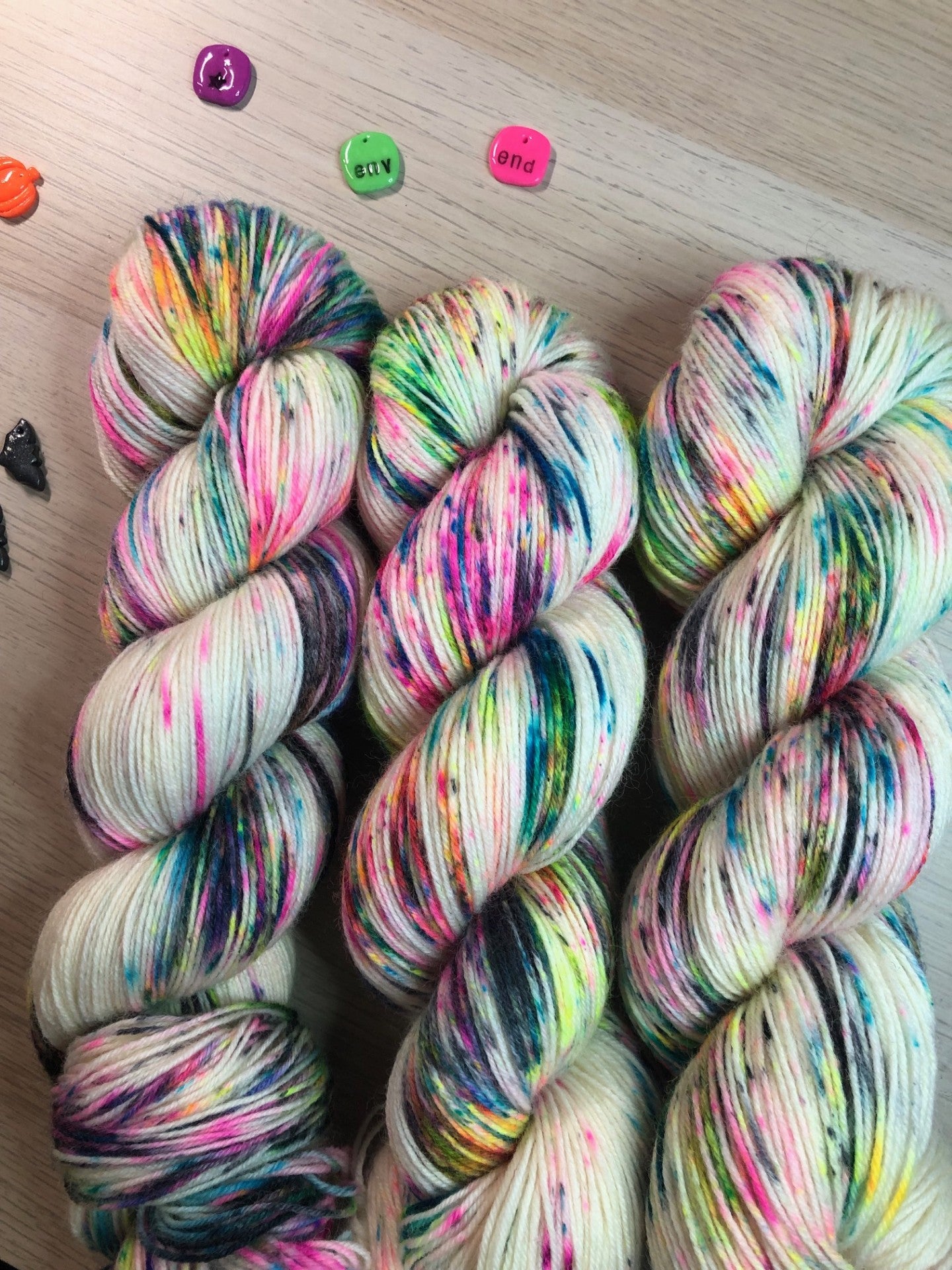 Je teins à la main, dans mon petit atelier, des laines en petites quantités — pour que chaque création soit unique. Mon univers est résolument joyeux, vif et plein d’énergie : des teintes pop, des nuances fluo, des contrastes audacieux qui feront vibrer vos projets tricot.